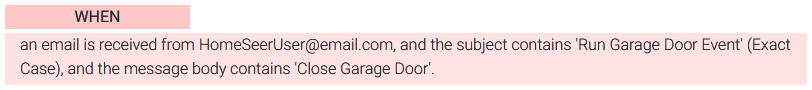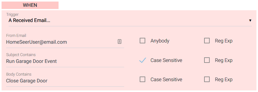 This trigger will execute an event when an email is received. You can specify the From email address, subject contents and body contents. If you are familiar with regular expression (Regex) syntax, you can also use that. In the example below, an event will be executed when an email from HomeSeerUser@gmail.com with Run Special Event in the subject and Close Garage Door in the body is received.