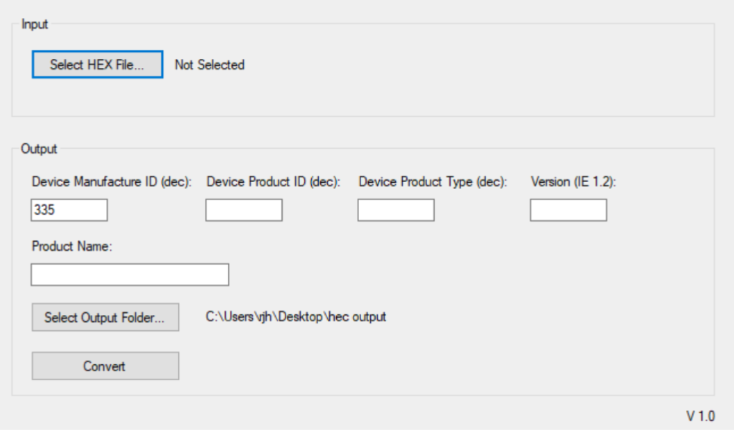 - In the Output section fill out the manufacturer ID, Device Product ID, Device Product Type, and the firmware version number.