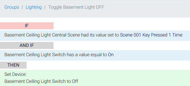 Trigger: Pressing the bottom paddle once = (Device XXX) Central Scene 002 Key Pressed 1 Time Condition: Load is Off = (Device XXX) has a value equal to Off Action: Turn Load On = Set Device (Device XXX) to On | Trigger: Pressing the top paddle once = (Device XXX) Central Scene 001 Key Pressed 1 Time Condition: Load is On = (Device XXX) has a value equal to On Action: Turn Load Off = Set Device (Device XXX) to Off |