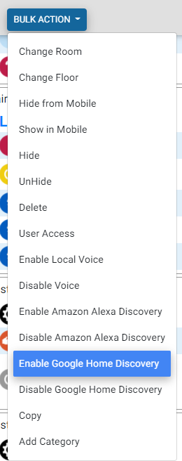 - Open the Bulk Action menu at the top of the devices page and select Enable Google Home Discovery