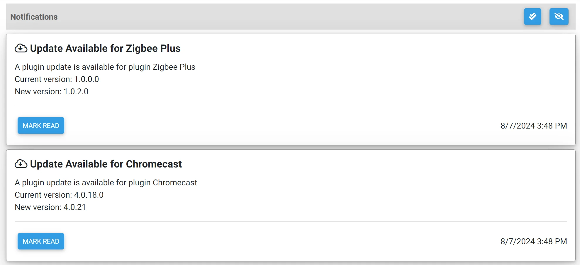 Click the MARK READ button at the bottom of a card to hide that notification. All read notifications are hidden by default. Click the button to UN-Hide all notifications.