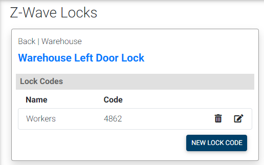 The Manage Lock page is a dedicated page to viewing and managing your dock lock codes. HomeSeer will not show codes programmed directly on your door lock. The codes show are only codes added through HomeSeer.