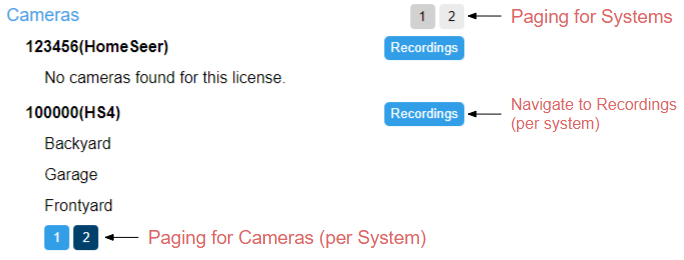 Similar to Systems and Users you will see two sets of paging. The first paging is for your systems. The second paging is for cameras per system. The maximum per page is three cameras.