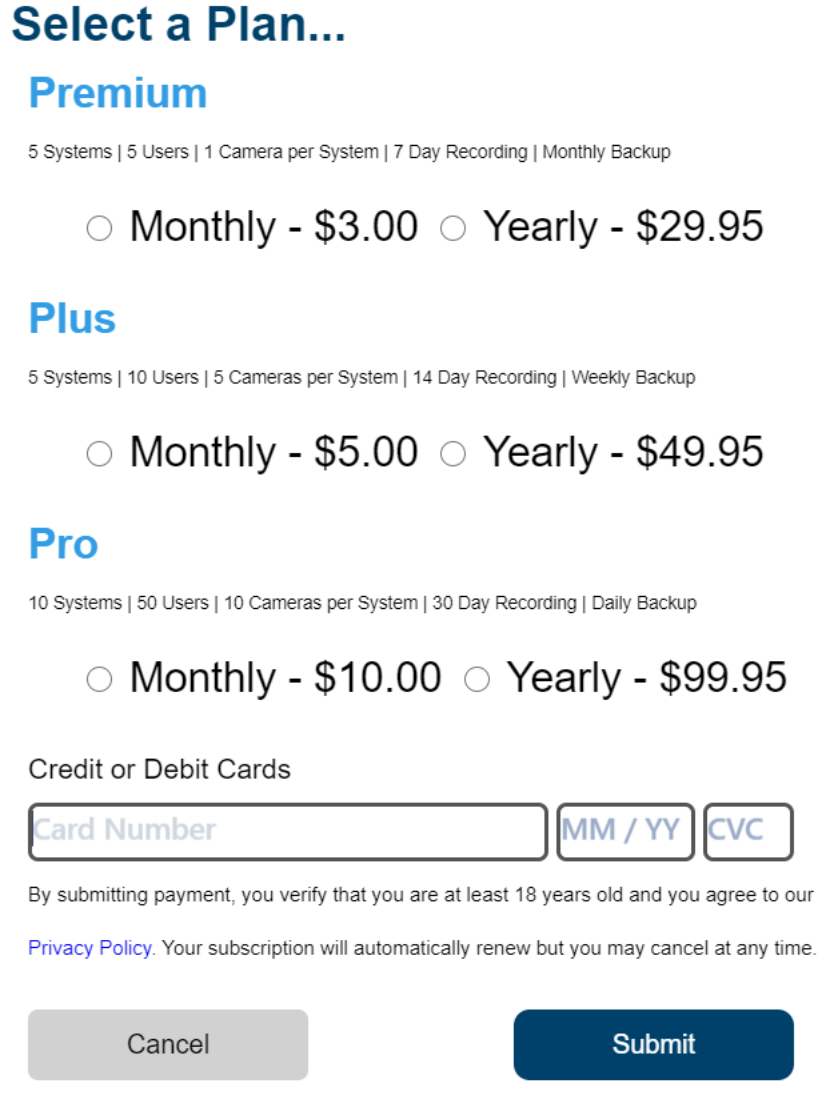 The Subscribe button will bring up a plan selection screen. Your options will include all 3 plans broken into Monthly or Yearly payments.