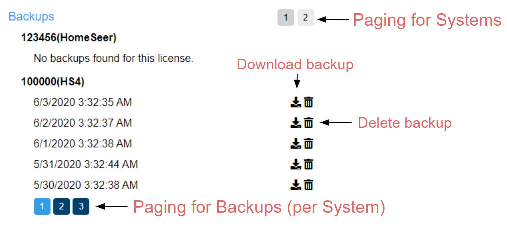 Similar to Systems and Users you will see two sets of paging. The first paging is for your systems. The second paging is for backups per system. The maximum per page is five backups.