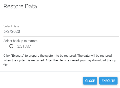 Selecting Restore... will bring up a prompt to select a date. Once a date is selected you will have the option to restore that backup by checking the button and clicking Execute.