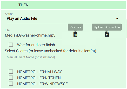 | Wait for audio to finish | Tick this box to ensure audio finishes playing before the next action is executed. The accuracy of this setting varies based on file type and size. It may be necessary to add a wait action if needed |