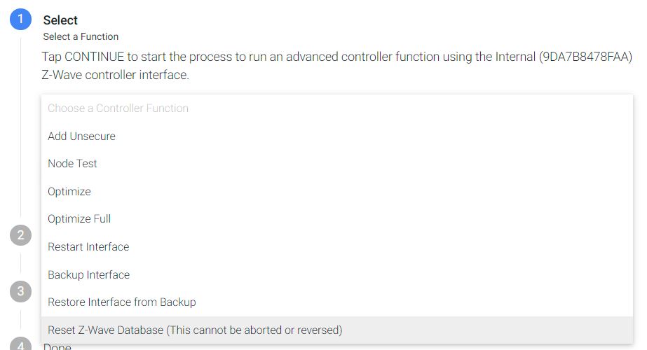 In rare cases, it is possible for a Z-Wave network's data to become out of date or out of sync. Resetting the Z-Wave data will not clear out your Z-Wave configurations, but will force a refresh of this data and can get unresponsive networks moving again.