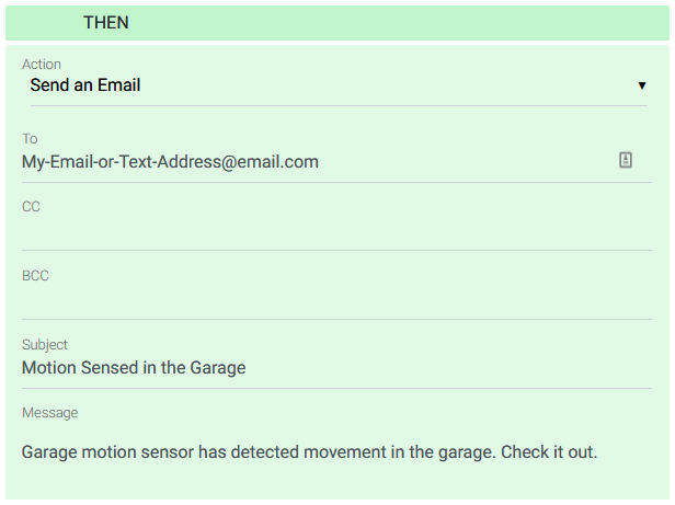 This action is designed to send an email or text message when an event is executed. The action may be accessed by selecting Send an Email from the action group menu.