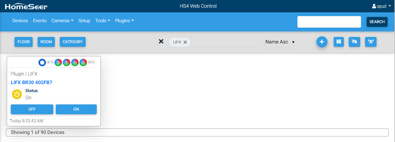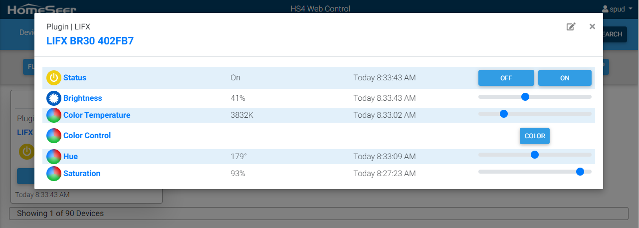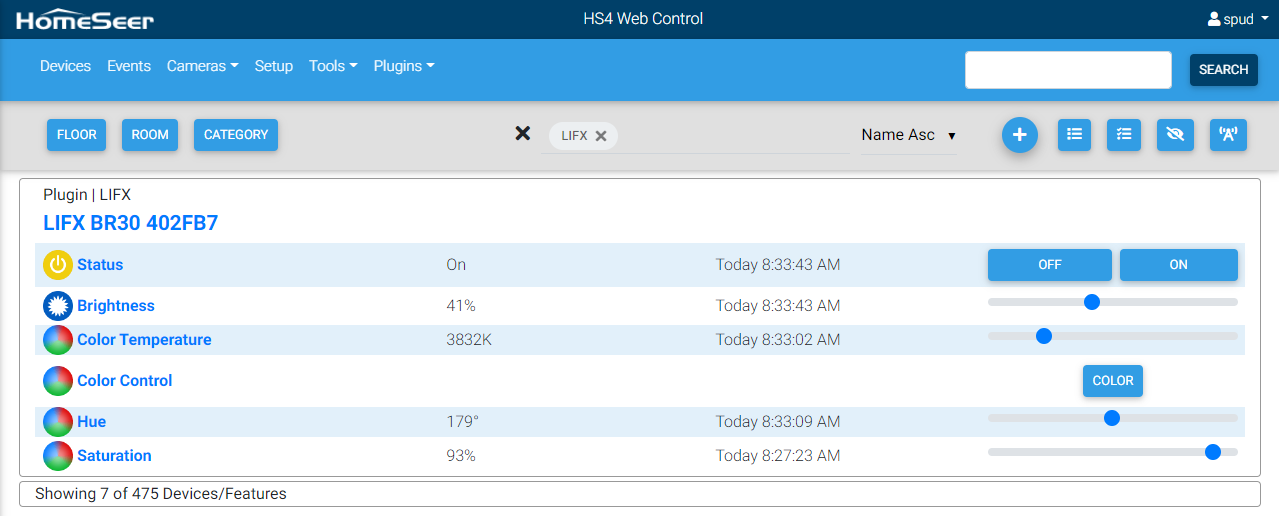 This plugin is designed to allow HomeSeer HS4 to monitor and control LIFX bulbs. These features are supported: