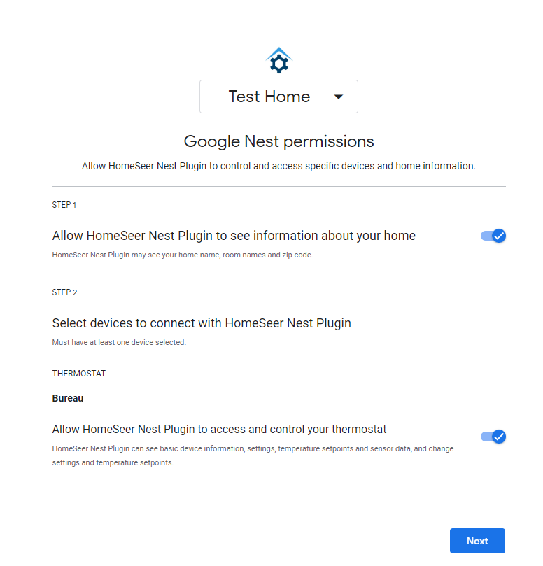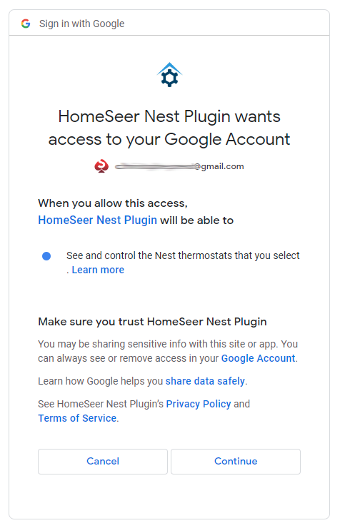 - Log in with the google account where the thermostat is configured and allow "HomeSeer Nest Plugin" to access and control your thermostat: