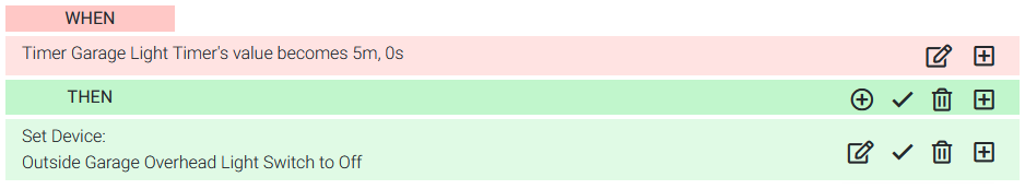 In this example, a garage light is turned off when a timer reaches 5 minutes. The timer itself can be controlled by another device, like a motion sensor, restarting every time motion is sensed. The net effect is that light will remain on in the garage until 5 minutes after the last motion is sensed.