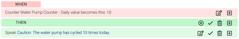 In this example, a spoken alert is issued when a water pump counter reaches 10. The counter can be controlled by energy sensing outlets or smart plugs.