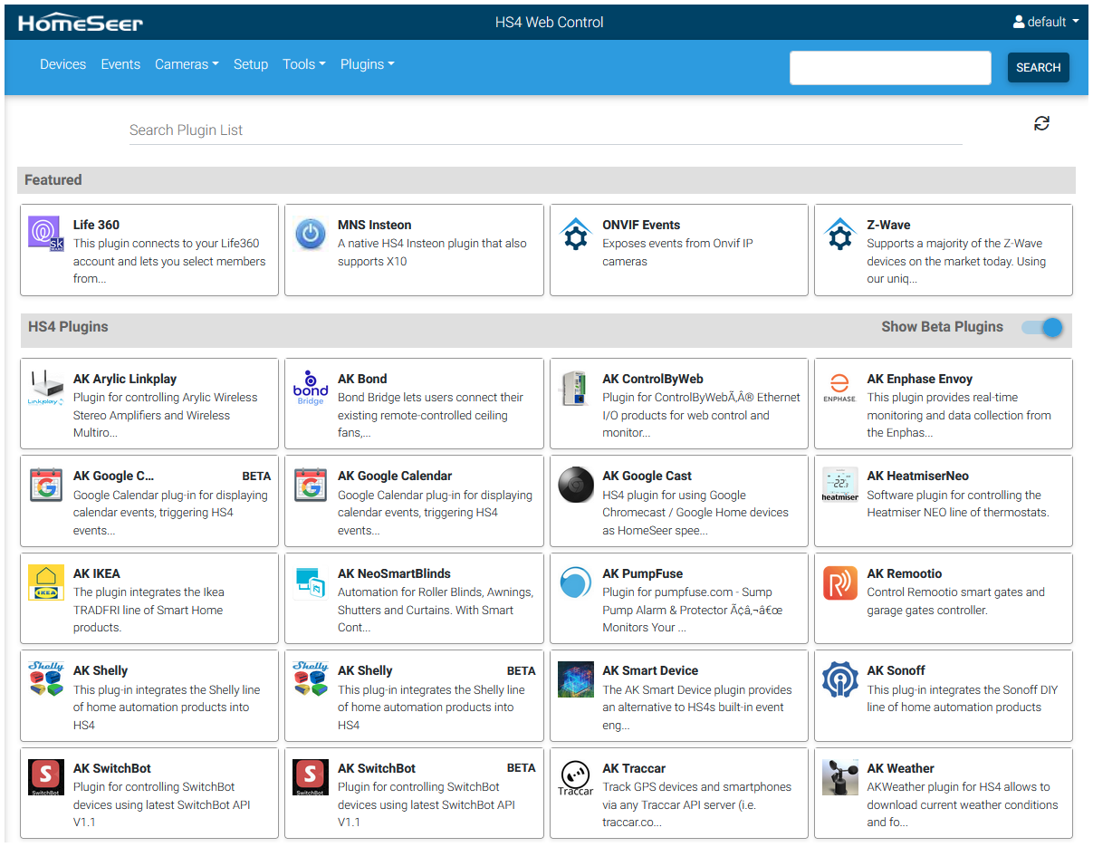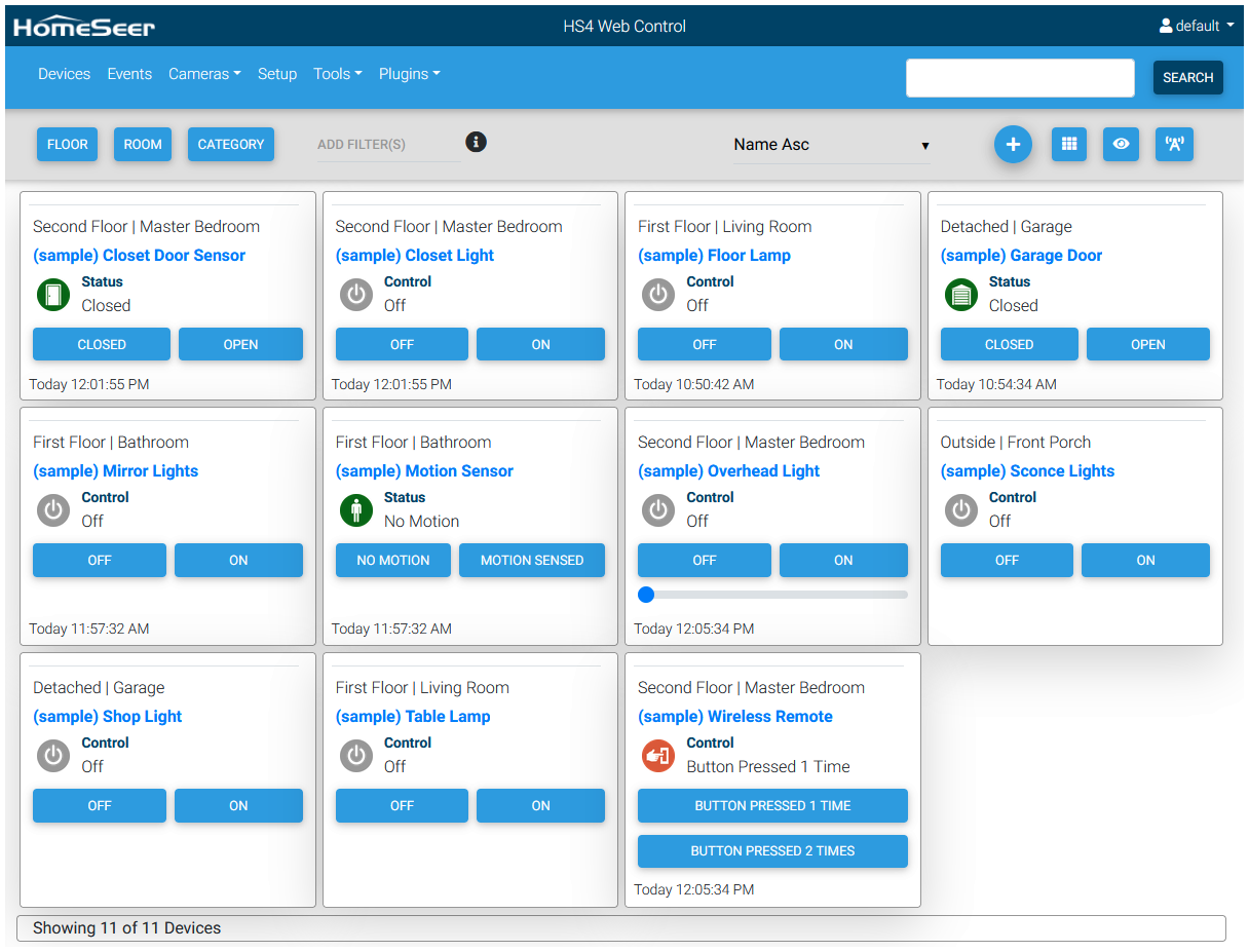This following collection of HomeSeer "sample" devices should now appear. These devices represent common smart home products and they are all controllable. Feel free to click their buttons to see how they change status and to see how they interact with other devices. These interactions are controlled by HomeSeer Events (automations).
