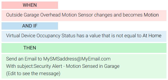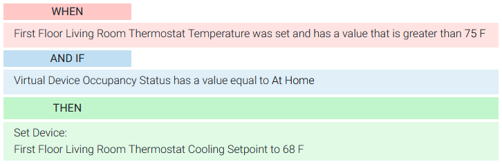 | Event to Issue Alert When Motion Sensed and Occupancy NOT At Home | Event to Turn on the AC when Temperature Rises and Occupancy set to At Home |
