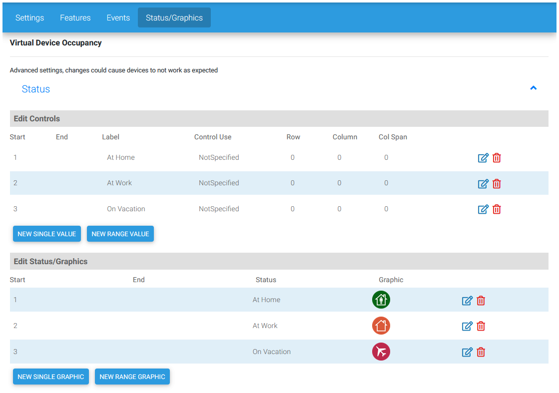 | On the HS4 Devices page, click the | Access the Status/Graphics page and add 3 values with text and icons as shown above. | Click the 3 blue buttons to confirm that the text values and icons change status |