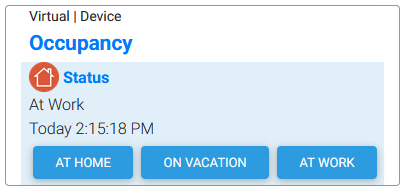Create a virtual device to track 3 different types of occupancy; At Home, On Vacation, At Work. This device can be controlled manually (by pressing the blue buttons) or it can be controlled with events.