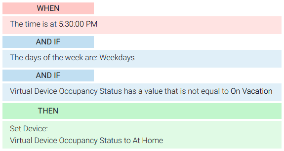 | This event fires at 8:30 AM on weekdays when you're not on vacation and sets the Occupancy device to At Work. | This event fires at 5:30 PM on weekdays when you're not on vacation and sets the Occupancy device to At Home. |