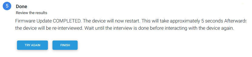 In the Done step, click the FINISH button if the update was successful. If not, click TRY AGAIN and the stepper will repeat.