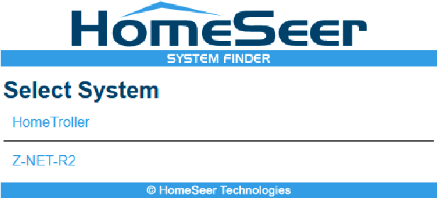 Navigate to find.homeseer.com to access the system finder. You should see two links displayed, one for your HomeTroller hub (or HS4 system) and one for your Z-NET. If you don’t see the Z-NET link, wait for a few minutes and refresh your browser.